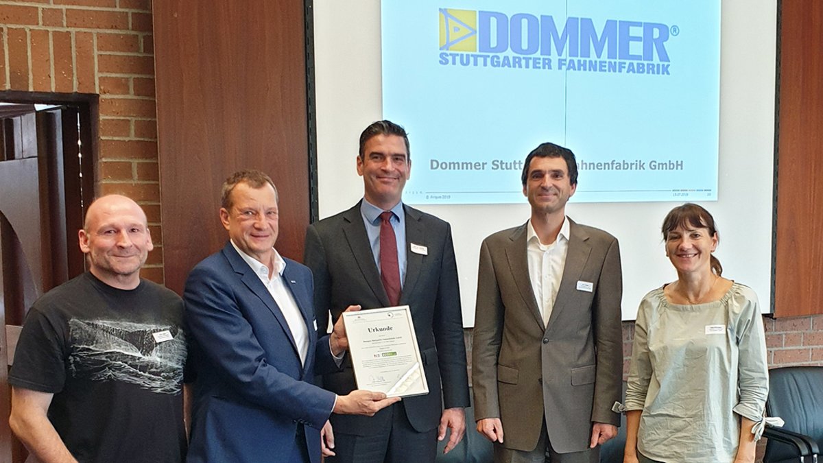 Vor kurzem wurde die Dommer Stuttgarter Fahnenfabrik im Rahmen des Projekts ECOfit vom Ministerium für Umwelt, Klima und Energiewirtschaft Baden-Württemberg für ihr vorbildliches ökologisches Engagement ausgezeichnet. Dr. Christian Sußner, Dezernent für Umwelt, Technik und Bauen des Landkreises Ludwigsburg und Arno Maier, Klimaschutz- und Energieagentur Baden-Württemberg GmbH (KEA), überreichten den teilnehmenden Unternehmen bei der Abschlussveranstaltung im Ludwigsburger Kreishaus die Urkunden für deren Engagement im betrieblichen Umweltschutz.