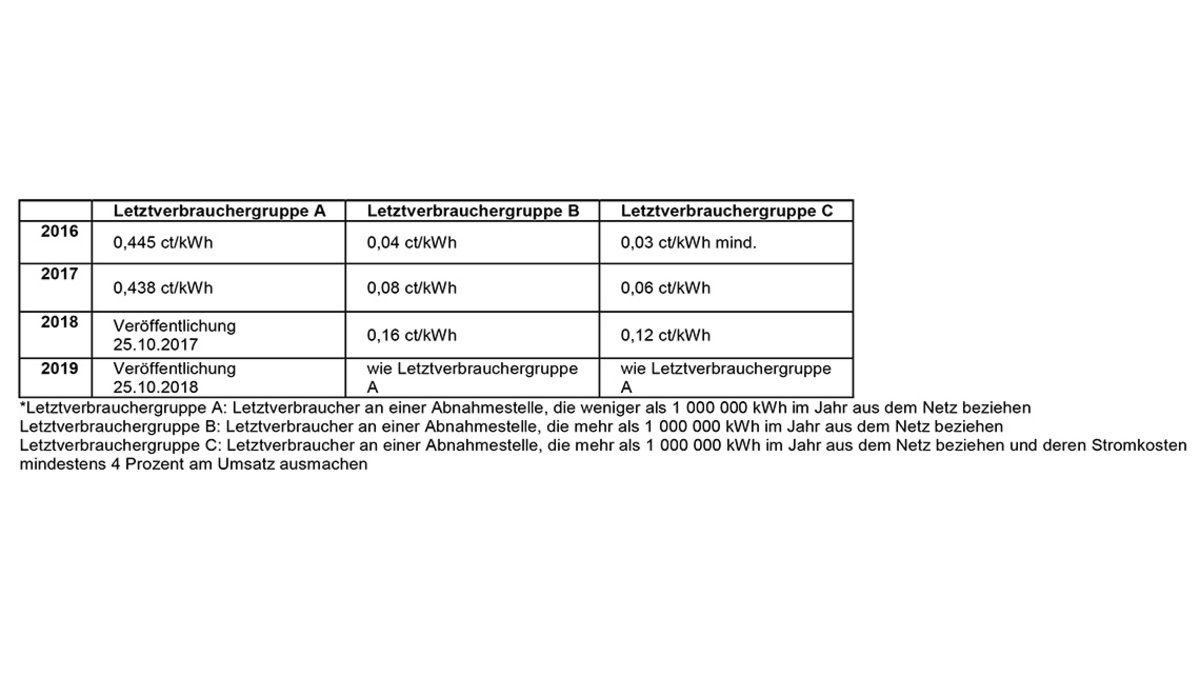 *nicht privilegierte Unternehmen bezahlen 2017 grundsätzlich 0,438 Cent/kWh bzw. es gelten die u.a. Übergangsregelungen.