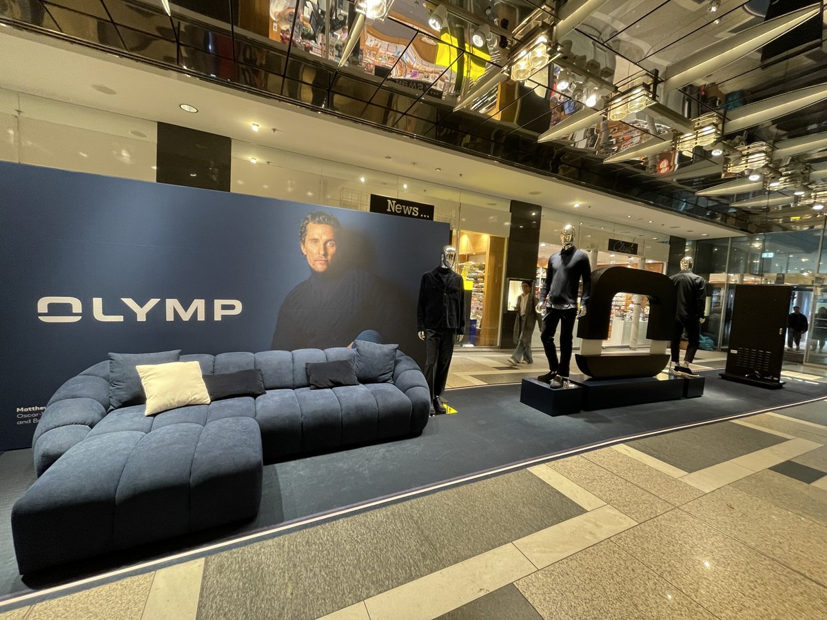 Im Zentrum der Pop-up-Fläche im Eingangsbereich der Herrenabteilung im Erdgeschoss stehen großflächige und emotional inszenierte Motive des Hollywoodstars Matthew McConaughey, die von einer hochwertigen Präsentation der aktuellen OLYMP Kollektionen an Hemden, Pullovern, Strickpolos und Overshirts umrahmt werden.