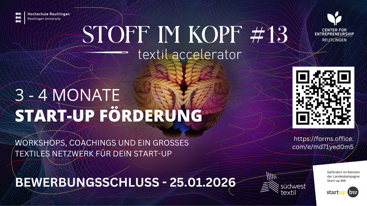 Der Textil.Accelerator Stoff im Kopf des Center for Entrepreneurship der Hochschule Reutlingen geht bereits in die 13te Runde. Das viermonatige Programm bietet textilbegeisterten Gründerinnen und Gründern eine einzigartige Gelegenheit, ihre Ideen im Bereich Textilgründung weiterzuentwickeln.